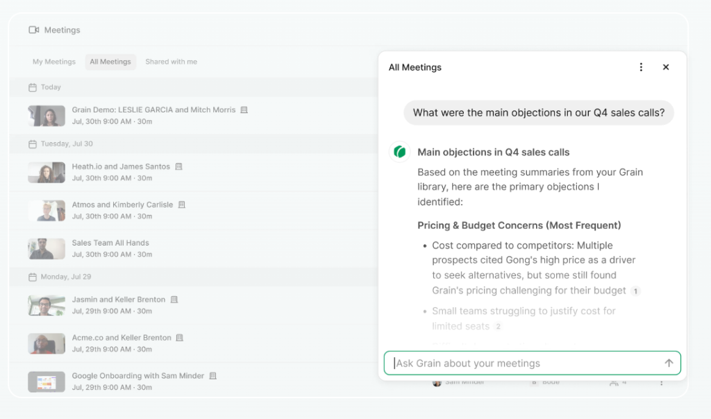 Grain AI is an AI meeting tool that records calls and turns them into searchable notes, transcripts, and shareable highlights. It’s commonly used to capture important moments from meetings – like key customer quotes, decisions, objections, and next steps – then share those clips and summaries with teammates or stakeholders without making them watch the full recording.
