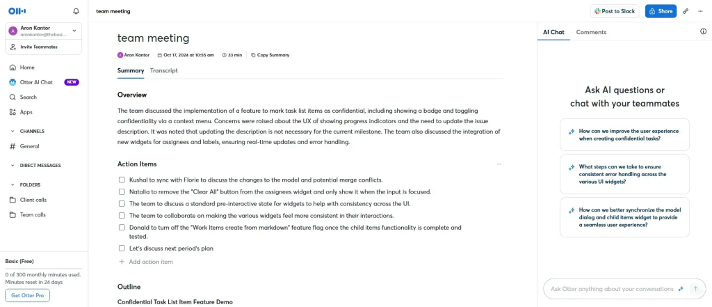 Otter.ai remains a major player for real-time transcription, turning meetings and interviews into searchable, shareable text with multi-speaker identification. It emphasizes transcription accuracy and speed, layering summaries, action items, and instant collaboration (comments, assignments, AI chat) on top. Teams can follow along with live captions, highlight key points in the moment, and later search by keywords and phrases to retrieve decisions fast. Seamless Zoom integration enables automatic capture and summaries so you can stay focused on the discussion. Note: Otter is English-first and may struggle with heavy accents or noisy environments, and the free plan limits monthly minutes.