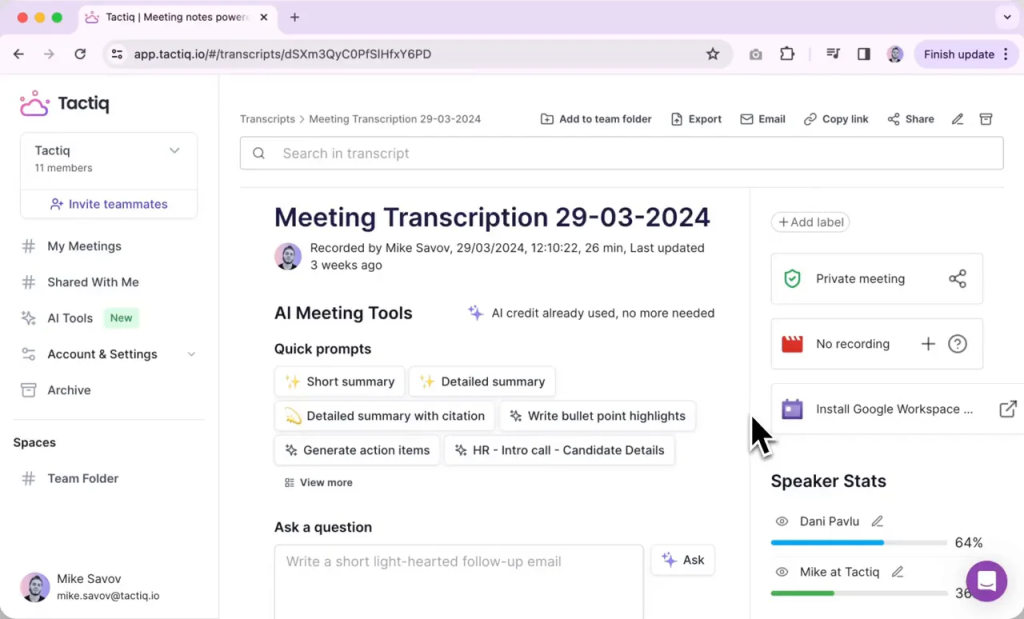 Tactiq is a browser-first assistant for real-time transcription and task management that layers directly on Google Meet, Zoom, and Microsoft Teams via a Chrome extension. It captures live captions with speaker identification, lets you timestamp and highlight key moments in the meeting sidebar, and generates AI summaries, action items, agendas, and follow-up emails. After the call, you can query the AI about what was discussed, access recordings, and push tasks into tools like Jira or Slack with simple automations. It also supports uploading past transcripts or audio for cleaner summaries and improved context. Note: accuracy can drop with unclear audio or heavy accents, especially in some non-English languages.