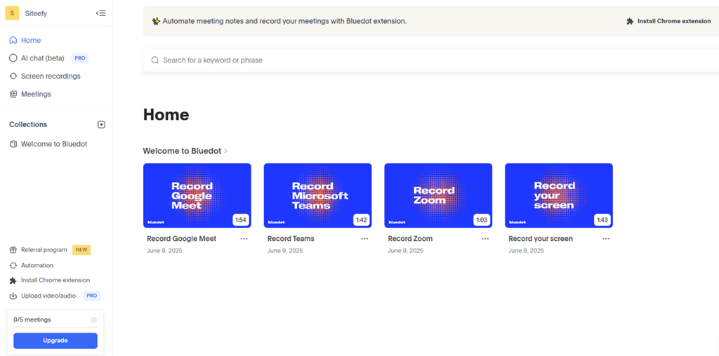 Bluedot is a bot-free, Chrome extension-based meeting assistant that delivers fast, accurate transcription and notes without inviting a bot to your calls. It supports 100+ languages, advanced speaker identification, and tight CRM integrations, generating transcripts and structured notes in seconds. Teams can ask AI questions about the meeting, auto-draft follow-up emails, and search across all transcripts for quick retrieval. For richer context, you can edit video by editing the transcript, annotate moments, and share highlights. Built for sales, client-facing, and project teams, Bluedot runs across macOS, Windows, iOS, Android, and Chrome with a private-by-default approach.