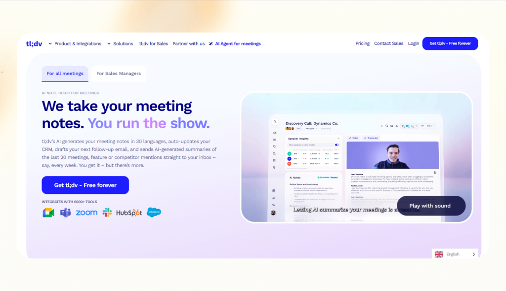 tl;dv is an async-first AI notetaker that records and transcribes Zoom, Teams, and Google Meet, then turns meetings into searchable, shareable assets. It can auto-update your CRM, draft follow-up emails, and provide coaching insights while staying lightweight and easy to deploy. Multi-meeting intelligence analyzes patterns across calls and emails you the takeaways so distributed teams stay aligned without rewatching full recordings.