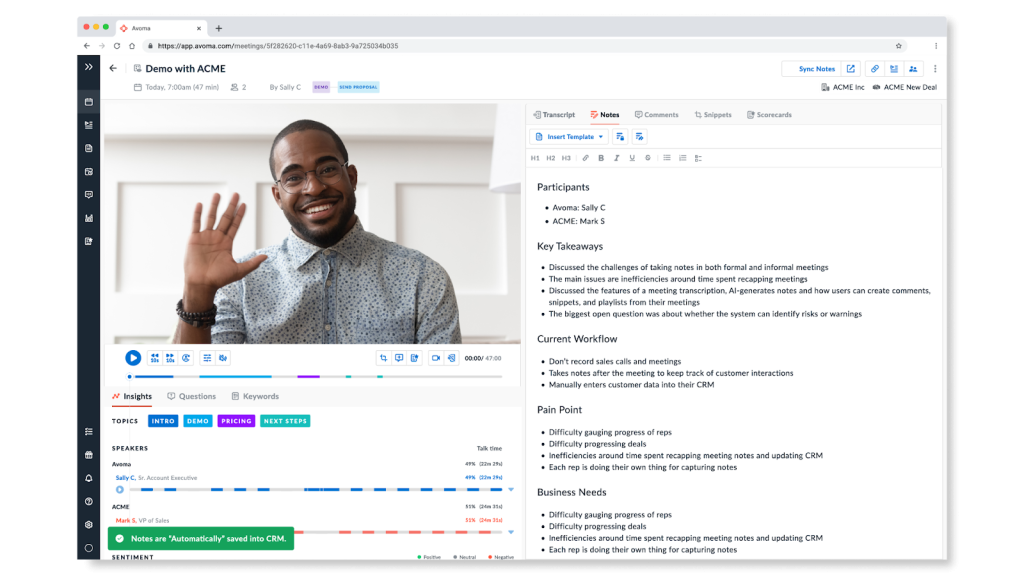 Avoma is an AI meeting assistant for cross-functional teams that need clean summaries, action items, and centralized visibility across sales, success, and product. It records on Zoom, Google Meet, and Microsoft Teams, syncs agendas with transcripts, and generates post-call notes you can push to Slack, CRMs, or internal docs. Conversation intelligence covers talk time, objection handling, and sentiment, while managers can review calls and coach with highlights. Avoma shines when you want end-to-end meeting workflows, collaboration, and easy adoption.