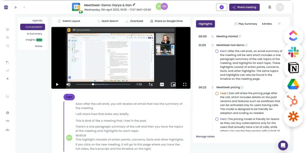 - Broad integrations (Slack, HubSpot, Google Drive/Calendar, Zapier) for quick handoffs