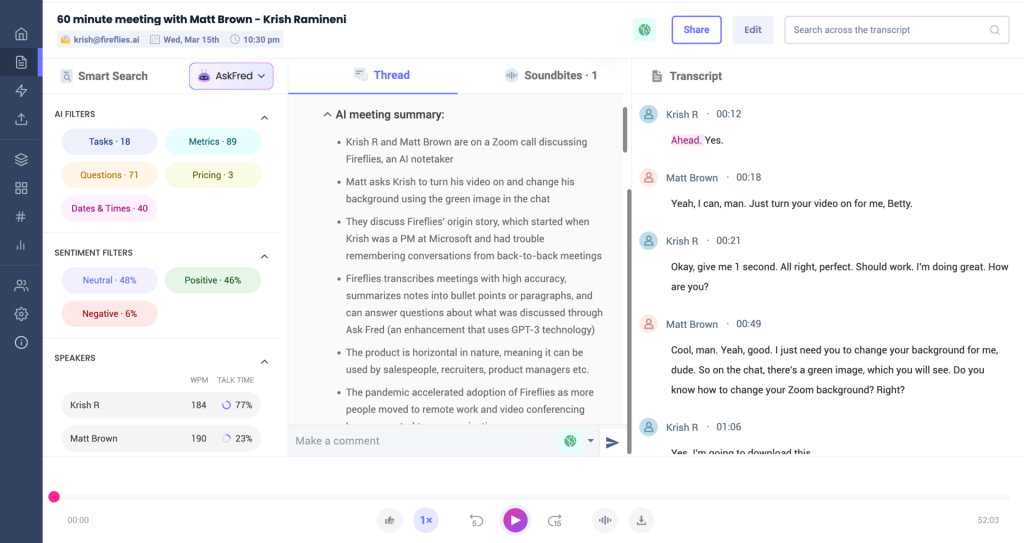 Fireflies.ai is a popular AI note taker and meeting recorder that excels at fast recap and retrieval. Powerful AI search lets you review a one-hour call in minutes, and a central library creates a searchable knowledge hub across recordings. With cross-platform transcription, video recording, and CRM integrations, it supports recap and light follow-up workflows for sales and CS. For reliable recording, summaries, and rapid search, Fireflies is a credible, cost-effective pick.
