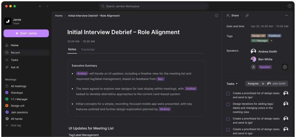 6. Jamie – On-device, bot-free multilingual transcription/summaries with GDPR-first privacy and low-friction workflows.
