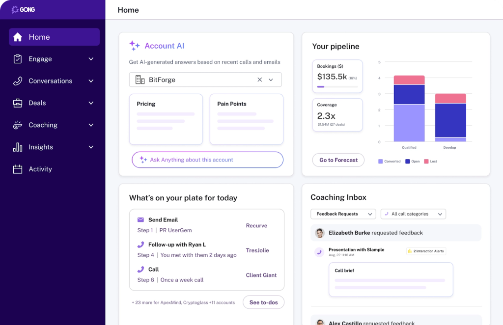 7. Gong – Conversation and deal intelligence with risk flags, coaching, AI forecasting, and strong Salesforce integrations.