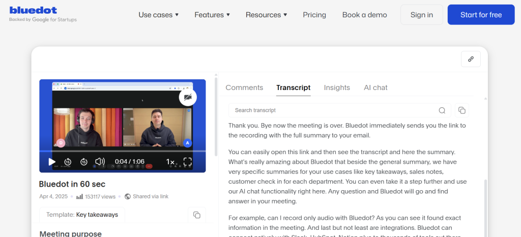 • Bluedot – Bot-free, browser-first with polished notes; good accuracy and fast handoff to CRM, especially on Google Meet.